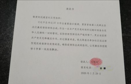 “我志愿报名参加社区抗击新型冠状病毒感染的肺炎疫情战役……”1月29日一大早,一名年轻人到七星岗街道抗建堂社区递交了这样一封《请战书》,希望加入到这场没有硝烟的战“疫”中。