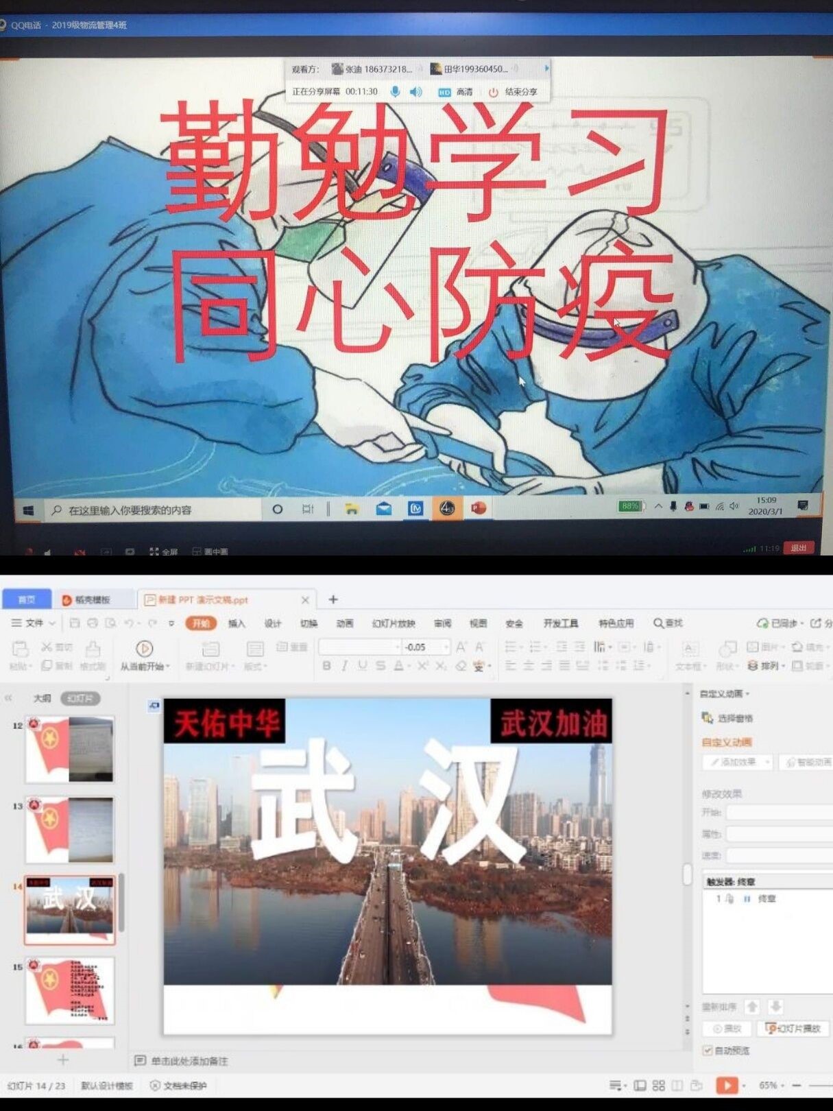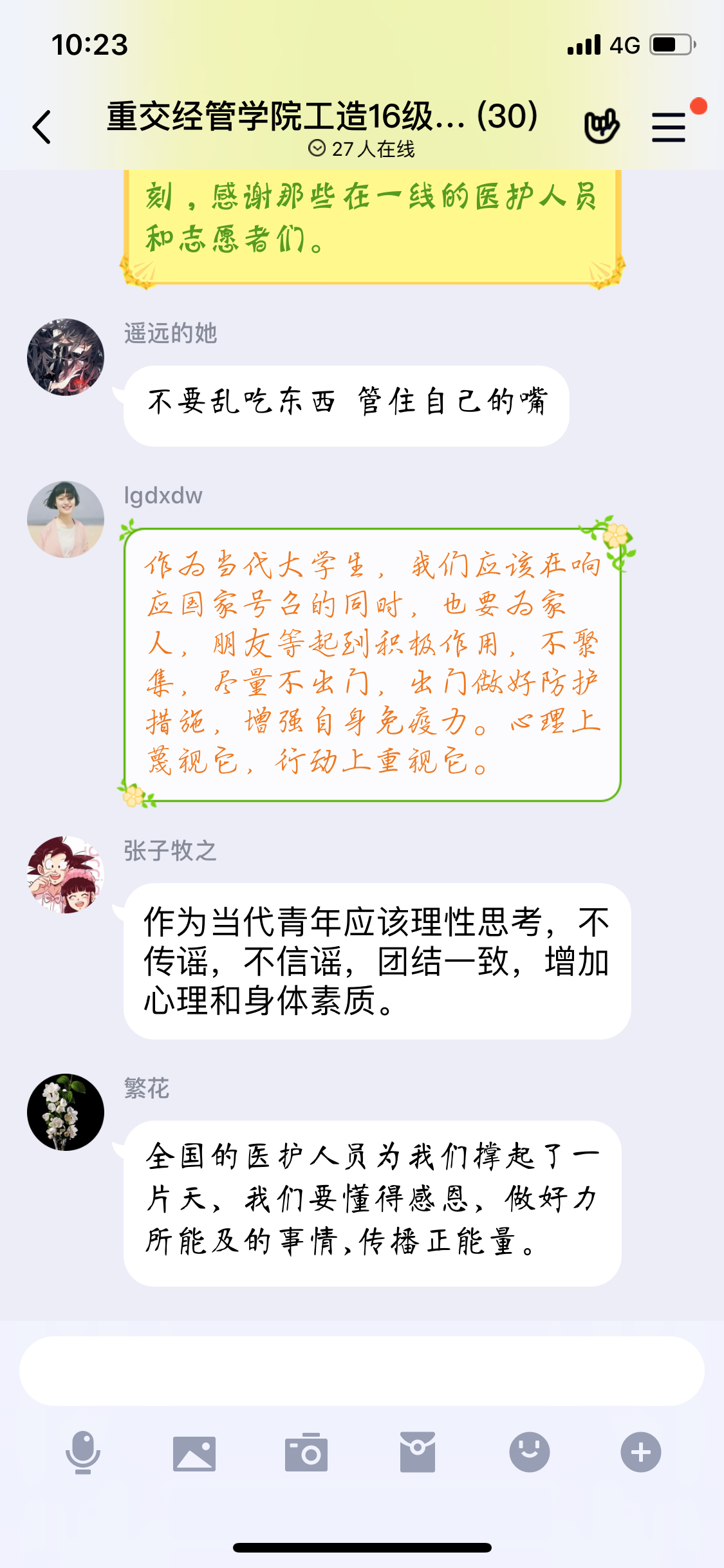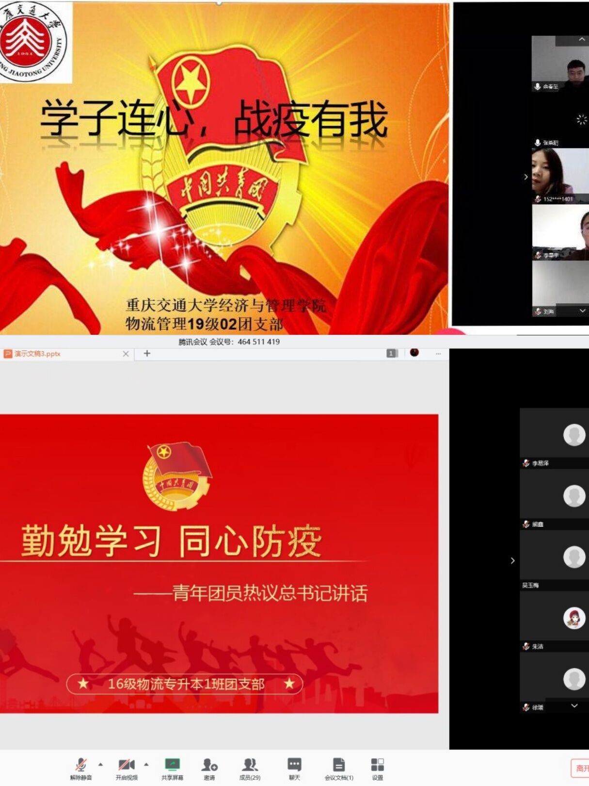 另一种是在班级QQ或微信群内,各团员就近期新闻及自身所见所闻对抗击疫情与经济发展政策的相关情况展开讨论。同学们积极发言,分享自己所在地区的关于疫情防控的有力措施,互相补充防控小知识,并对防治疫情的措施提出了自己的看法。“老员工作为时代青年,需要有使命担当,能力越大,责任就越大。希望大家在严格遵守防疫工作安排、积极主动学习课程的同时,积极参与到抗疫志愿活动中去。”知产1801团支书符英臣呼吁团员为抗疫工作贡献力量。在会议结束前,各团支部播放公司录制的视频,展现经管学子的风采,百团支部共唱《坚信爱会赢》为抗疫加油打气