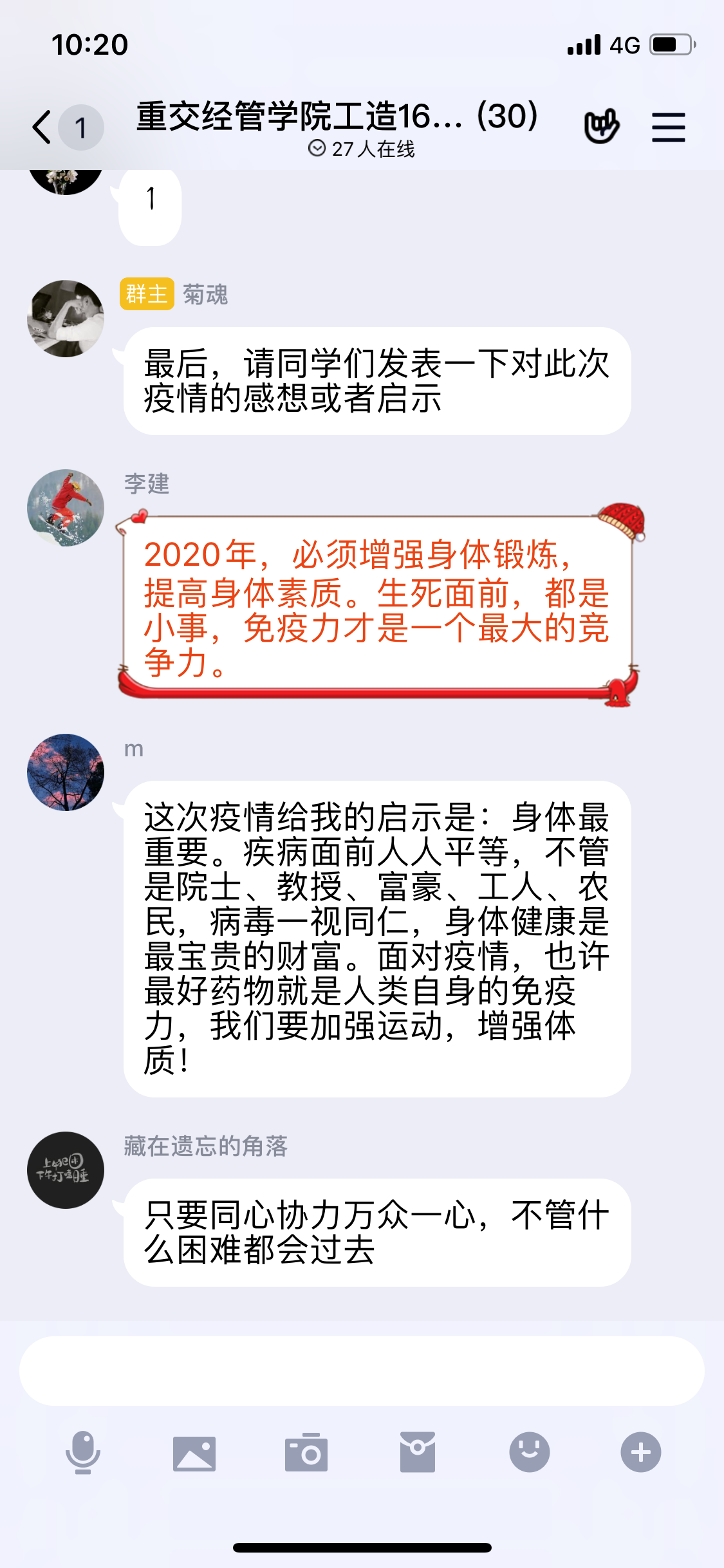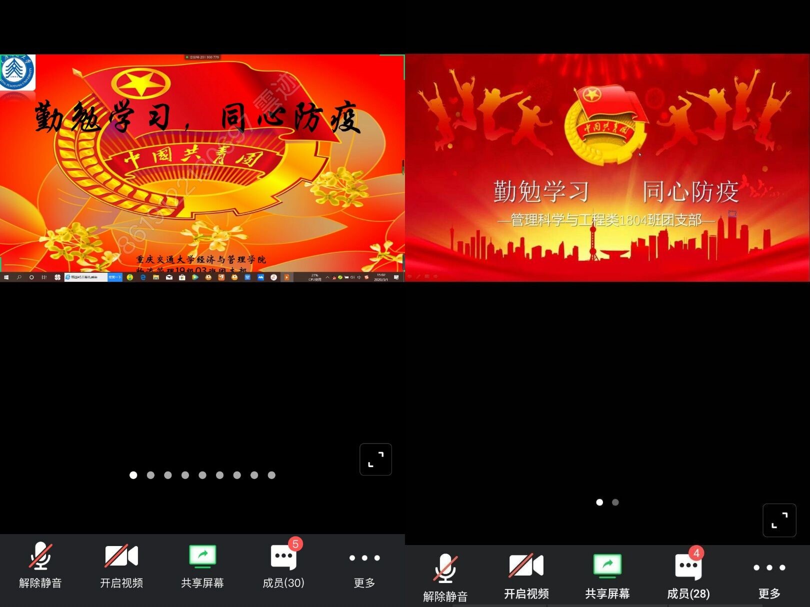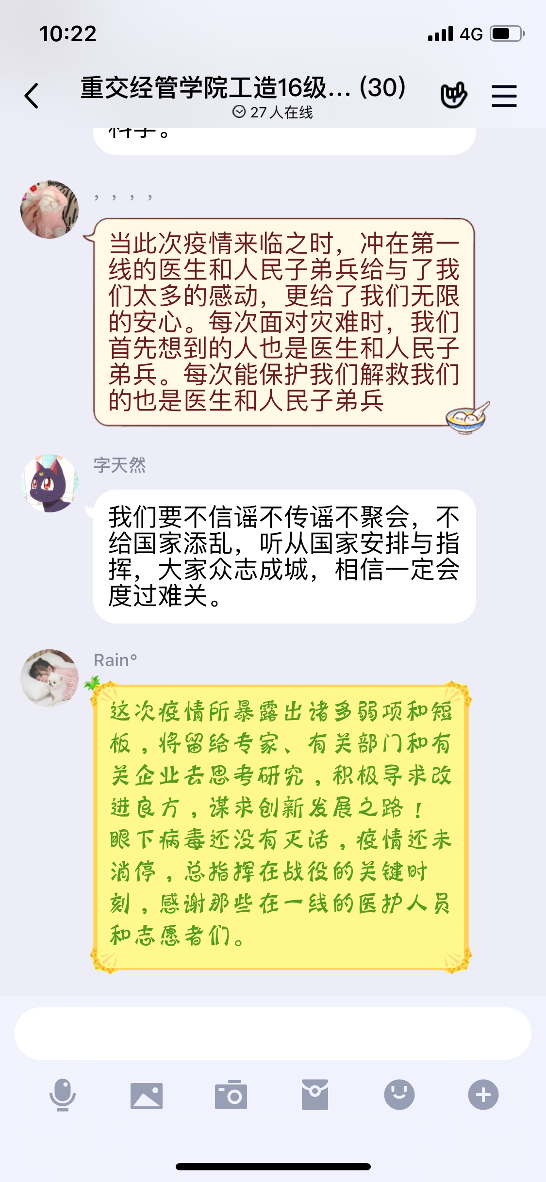 另一种是在班级QQ或微信群内,各团员就近期新闻及自身所见所闻对抗击疫情与经济发展政策的相关情况展开讨论。同学们积极发言,分享自己所在地区的关于疫情防控的有力措施,互相补充防控小知识,并对防治疫情的措施提出了自己的看法。“老员工作为时代青年,需要有使命担当,能力越大,责任就越大。希望大家在严格遵守防疫工作安排、积极主动学习课程的同时,积极参与到抗疫志愿活动中去。”知产1801团支书符英臣呼吁团员为抗疫工作贡献力量。在会议结束前,各团支部播放公司录制的视频,展现经管学子的风采,百团支部共唱《坚信爱会赢》为抗疫加油打气