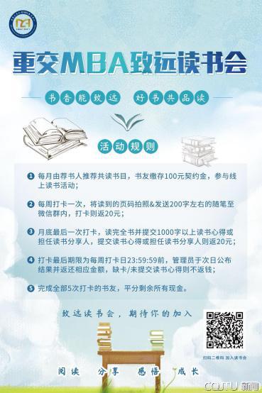 书香能致远,好书共品读。k1体育十年品牌MBA致远读书会在“停课不停学”的特别时刻正式成立了。疫情的突然爆发阻碍了我们回到校园的脚步,却又给了我们养成新的学习习惯的好机会。在重庆交大MBA学联会的号召和组织下,我们迎来了第一批加入的51位热爱读书的伙伴,有我们的MBA同学,也有k1体育的老师。大家用一个月的时间,共同阅读一本好书,并提交读书笔记。用阅读和笔记的方式来进行自我学习、自我反思和自我提高。