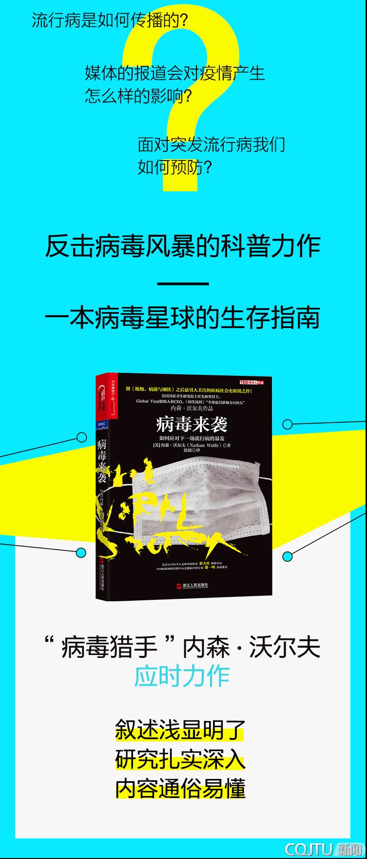 《病毒来袭》的作者是哈佛大学免疫学和传染病学博士、斯坦福大学人类生物学客座教授、美国国家卫生研究院主任先驱奖得主、《时代周刊》全球影响力100人之一——Nathan Wolfe。全书深入浅出地为大家揭开流行病的真面目,包括病毒从何而来,人类为什么会遭受流行病的侵害等。翻译家沈捷的杰出的翻译能力,也给这本书增添了几分光彩。在当前的情境下,是一本非常应时的好书。