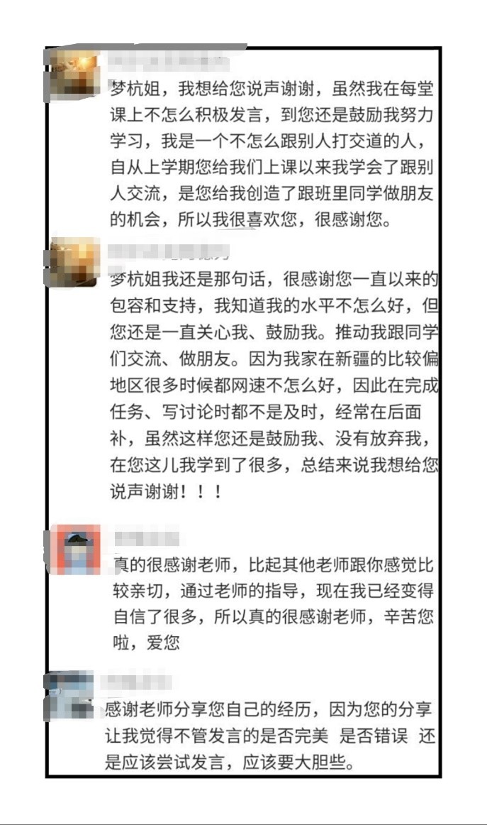 有同学表示:“感谢梦杭姐像姐姐一样,无时无刻不在教导我们要做一个不断创新和学习的人。”有同学说:“老师的教学是我见过最认真的,之前老师教过我们标杆学习法,我认为您就是我的标杆。”有同学留言:“梦杭姐真的让我眼前一亮,教师这份职业对您来说不是谋生的工具,而是您倾注半生心血去热爱的事业。梦杭姐对我们来说已经够优秀了,但还那么努力,是我的榜样!”还有同学说:“董老师,一直以来上课兢兢业业,为了上好课操催了心,一直不断探索如何提高课堂效果,让我们很感动,真的很感谢您的付出!”而这些回馈都反作用在员工的学习中,员工学习更积极主动了,全班拧成一股绳在拼搏,从老师到员工。