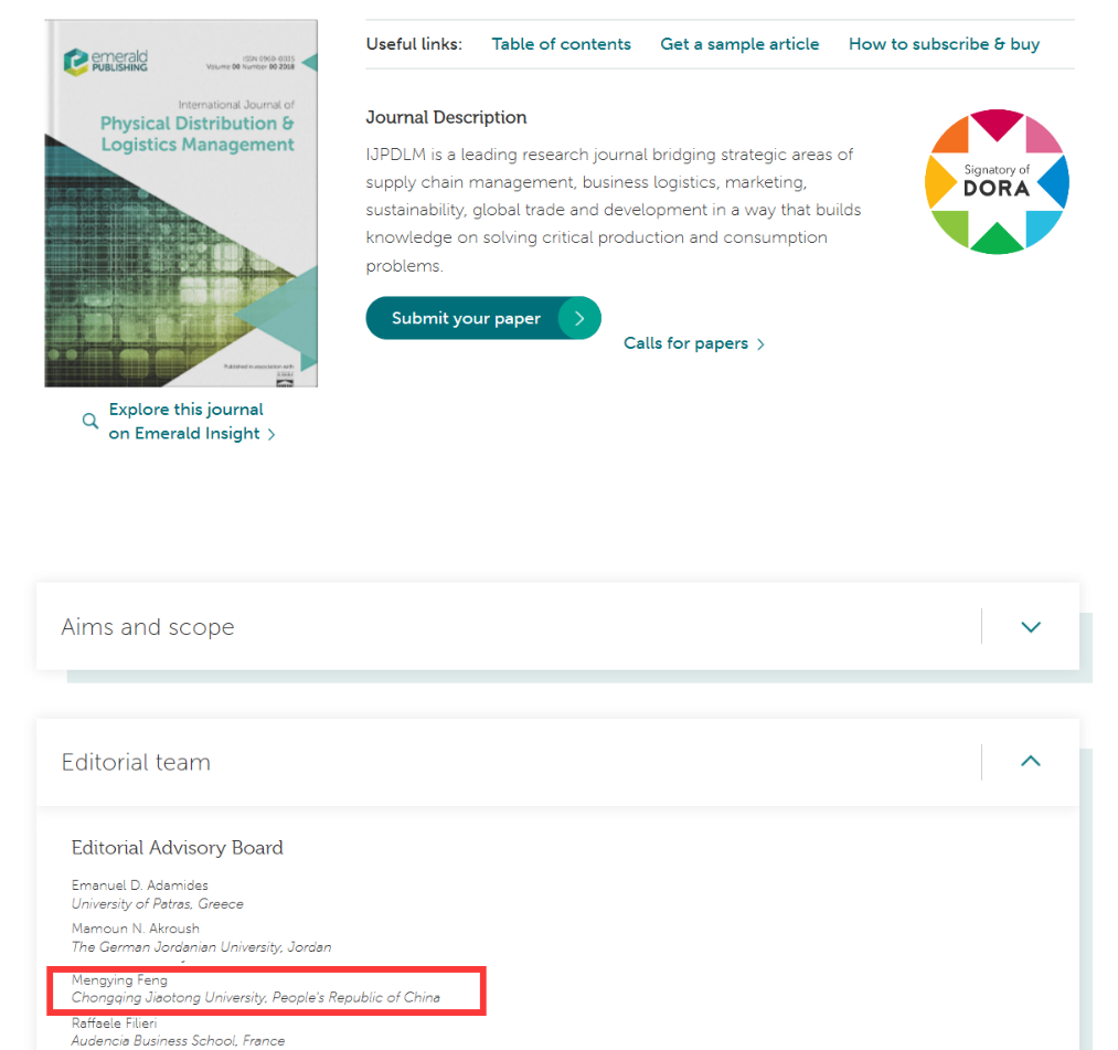 近日,物流与供应链管理领域高水平国际期刊International Journal of Physical Distribution & Logistics Management(IJPDLM,国际配送与物流管理)官网上更新了编委会委员,重庆市巴渝学者、公司k1体育经理助理冯檬莹教授入选。IJPDLM是SSCI期刊,JCR分区Q1(一区)。最新数据显示,该刊2018年影响因子5.212,五年影响因子5.704。