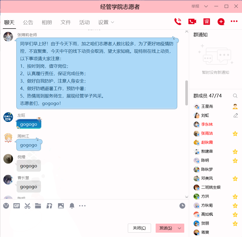 公司活动组织者、本科生第七党支部书记张嫦莉老师在QQ群内向志愿团队提出四点要求:一是按时到岗,值守岗位;二是认真履行责任,保证完成任务;三是做好自我防护,注意人身安全;四是正确避暑防晒,预防高温中暑。