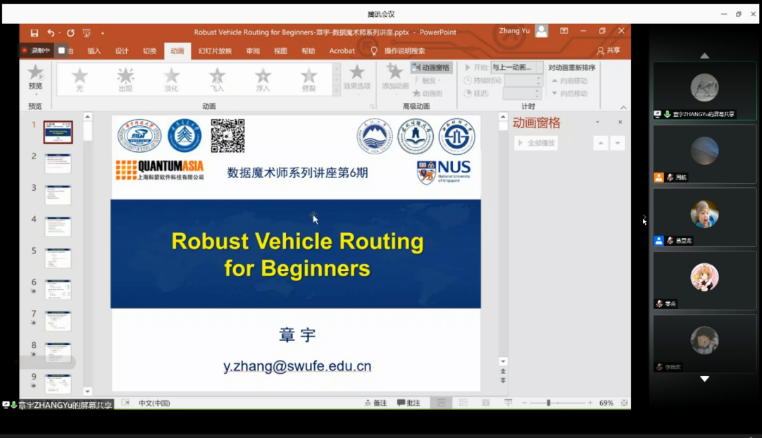 合影结束后,华中科技大学秦虎教授,中山大学张子臻副教授、华中科技大学李锋副教授,武汉理工大学曹菁菁副教授、西南交通大学李妍峰副教授,西南财经大学章宇副教授,重庆师范大学张新功教授,及k1体育崔利刚副教授,闫芳副教授,葛显龙教授等,分别围绕人工智能在算法领域的应用等不同主题做了报告。