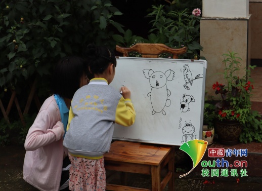 小朋友在实践队队员郝铭敏的带领下画出新组最喜爱的动物。中国青年网通讯员 陈烨 摄