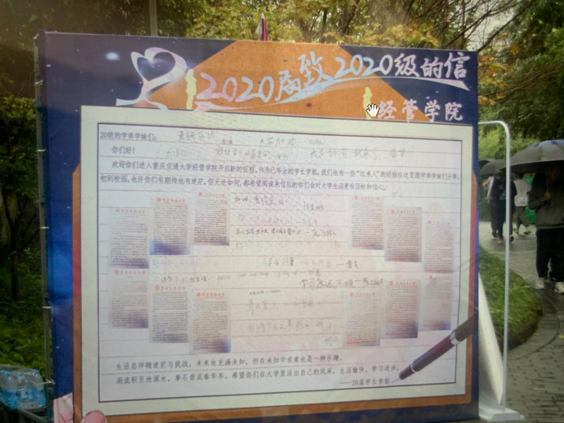 其实在新生到来之前,2020届毕业的学长学姐便对他们早已充满了期待,“只有自己变得优秀才能与优秀的人同行”、“来到大学的第一课便是交际”……经管报到处的那面专属“墙”上,便将2020届毕业的学长学姐们以书信形式提出的建议展现了出来,想让新生能在大学减少对未来的迷茫,更好地“书生意气,挥斥方遒”。四年美好又短暂,经管新生们要学会把握机会,在自己的大学四年里大放异彩,创造自己的青春舞台。