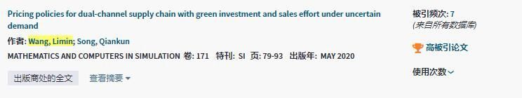 日前,据ESI数据库2020年9月更新的数据显示,公司k1体育王利敏以第一作者身份在就读博士期间于MATHEMATICS AND COMPUTERS IN SIMULATION上发表的题为“Pricing policies for dual-channel supply chain with green investment and sales effort under uncertain demand”的文章新增入选高被引论文。