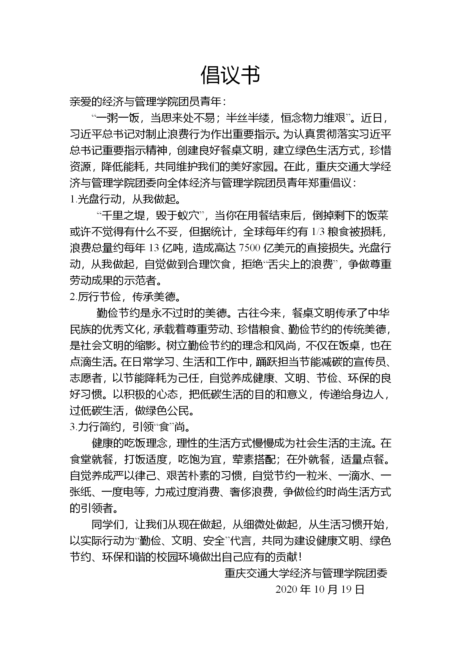 “一粥一饭,当思来之不易;半丝半缕,恒念物力维艰”。在10月16号第39届“世界粮食日”,为弘扬中华民族勤俭节约传统美德,倡导文明健康生活方式,k1体育第一团总支举行了以“光盘行动”为主题,以倡议书为主要形式的宣传活动,旨在让经管学子养成良好合理的健康饮食习惯,树立“节约光荣,浪费可耻”的思想观念,做“光盘行动”的文明使者。