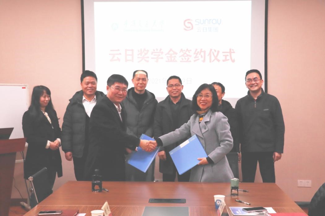 “老员工就业创业引导+企业员工学历提升”的联合机制,同与会人员围绕校企交流互动、人才共育、平台共建、科技攻关等方面进行了深入交流。最后,校企双方进行了“云日奖学金”签约仪式。