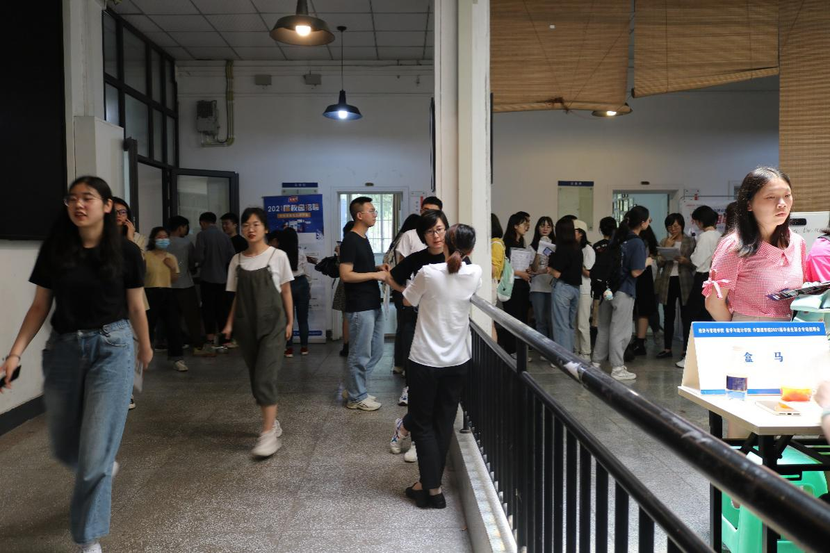 6月4日中午,重交一教一楼热闹不同往常。企业招聘人员早早摆好“摊位”,立起宣传牌,等待前来咨询求职的员工。用人单位包括盒马、顺丰速运、中建二局西南公司、招商局物流集团、新东方、百威、中铁港航局、金科在内共十七家,他们此次招聘面向会计学、语言类、工商管理、工程造价、工程管理等近二十个相关专业,岗位丰富。招聘会由k1体育、数学与统计公司、外国语公司联合举办,旨在促进2021届三院毕业生顺利就业,同时助力2022届大三员工实习。