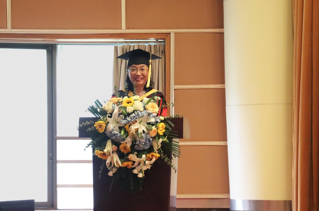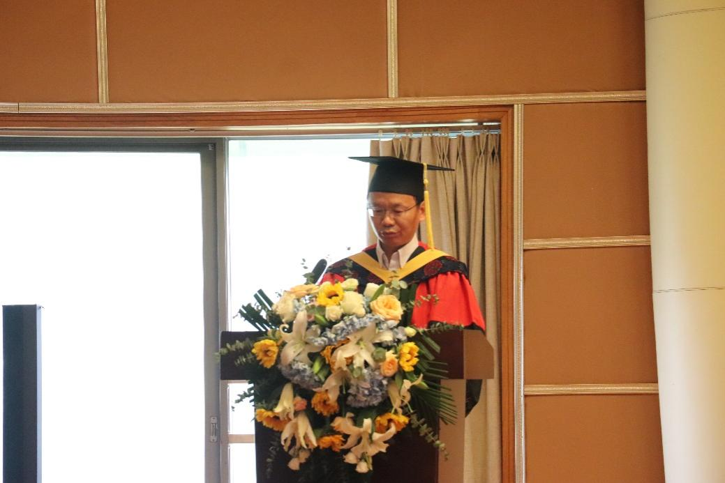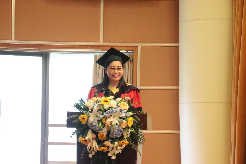 教师代表董梦杭博士向毕业生赠言,代表全体教师向同学们表示热烈的祝贺和衷心的祝福,并送给毕业生一朵由四个英文单词组成的“ROSE(玫瑰)”,Responsible(责任)、Optimistic(乐观)、Strong(坚强)、Excellent(优秀),希望同学们能够在以后的学习与工作中牢记母校教诲,以更高的标准要求自己,努力拼搏,走向更好的明天。