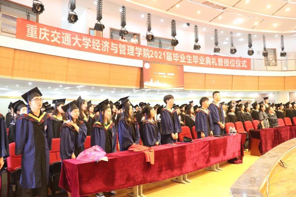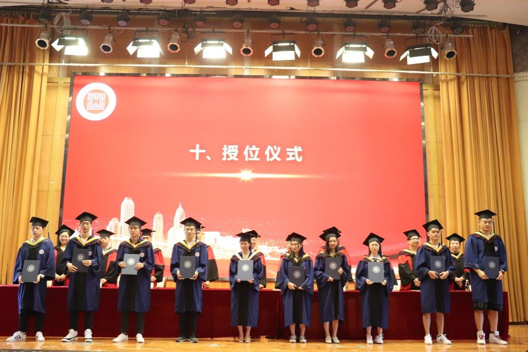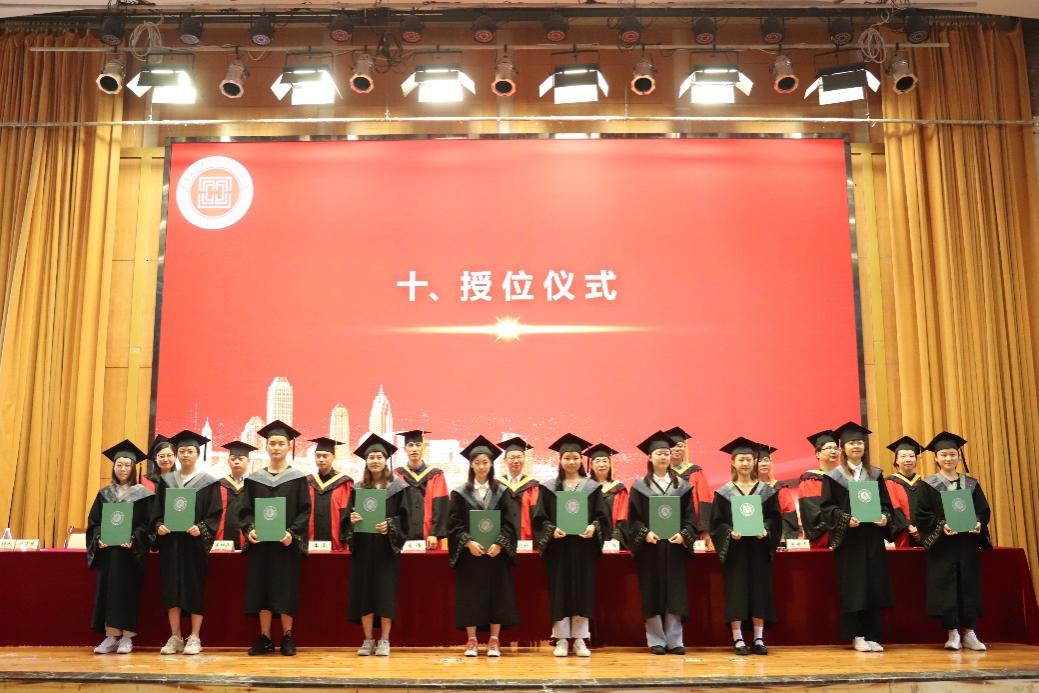 毕业典礼暨授位仪式在国歌声中开始。副经理肖伟宣读2021届硕士学位授予决定;副经理石超峰宣读2021届学士学位授予决定。
