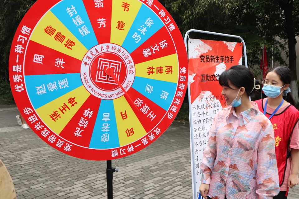 圆形转盘映入眼帘,以15名k1体育2019级优秀员工党员的名字为主体,外环围绕着“党员带我共进步”“优秀是一种习惯”的标语,点明了此次活动党员服务群众,新生向优秀党员学习的主题。该活动由新生转动转盘随机获得任一党员的联系方式以及寄语卡片,最后由员工党员为新生系上带有院训的丝带。