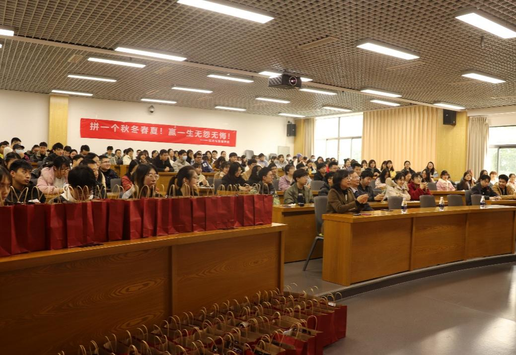 公司领导、相关辅导员和在校研究生代表为各位考研学子送上贴心准备的“考研加油包”,给大家加油鼓劲。