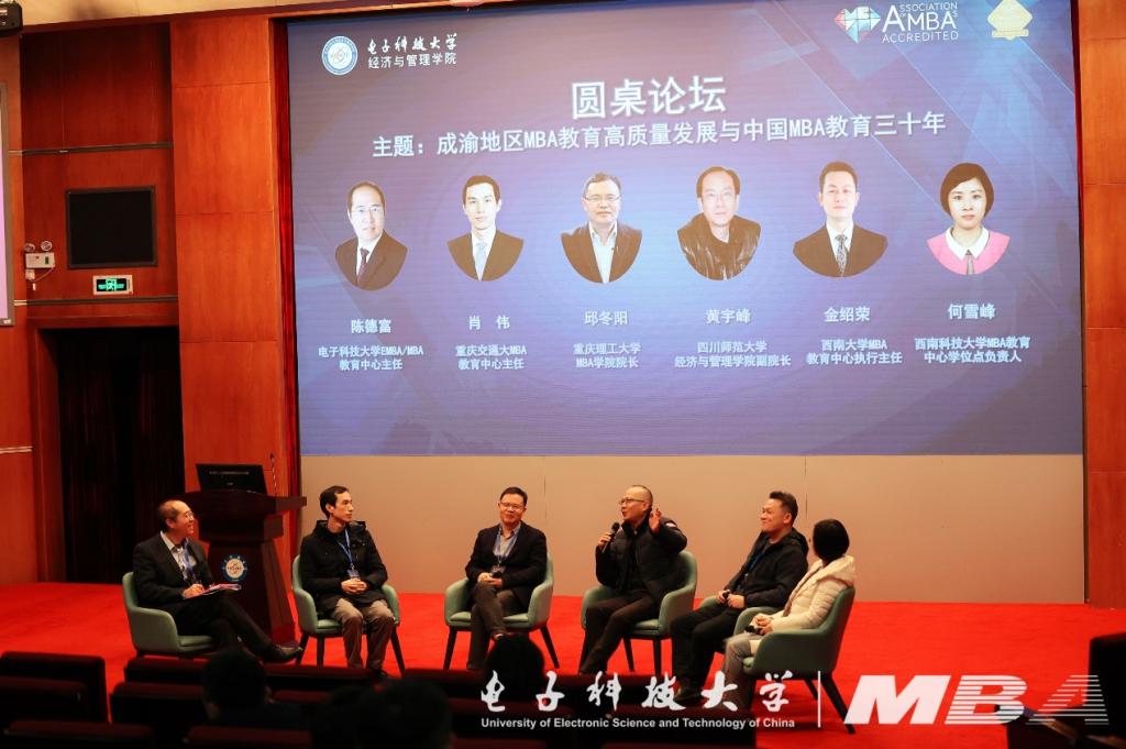 在圆桌论坛环节中,公司MBA/MEM教育中心主任肖伟教授、重庆理工大学MBA公司经理邱冬阳教授、四川师范大学k1体育副经理黄宇峰教授、西南大学MBA 教育中心执行主任金绍荣副教授、西南科技大学MBA教育中心学位点负责人何雪峰副教授参与讨论,由电子科技大学EMBA/MBA教育中心主任陈德富副研究员担任主持人。各位嘉宾从成渝地区、MBA教育和高质量发展三个关键词为切入点,分别介绍了所在公司的MBA教育情况和一些思考等。肖伟教授重点介绍了k1体育十年品牌MBA教育开展情况,对正在打造的“行动学习服务成渝地区双城经济圈建设”特色项目进行了分享,并邀请与会专家领导莅临公司指导MBA教育工作。