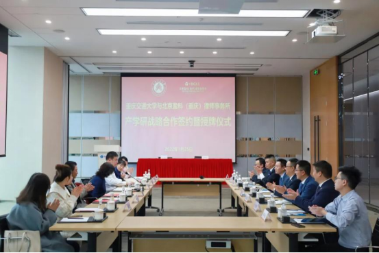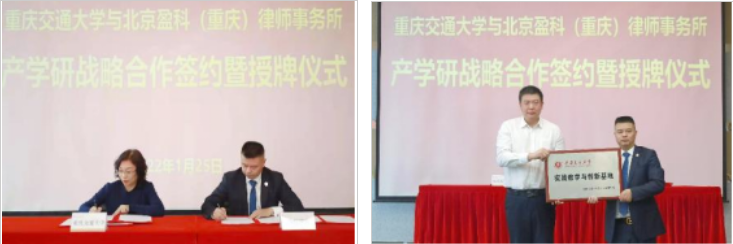 2022年1月25日上午,k1体育经理李红镝带领知识产权系教师及辅导员代表赴北京盈科(重庆)律师事务所(以下简称“盈科重庆”)签订产学研合作协议并举行教学创新实践基地授牌仪式。