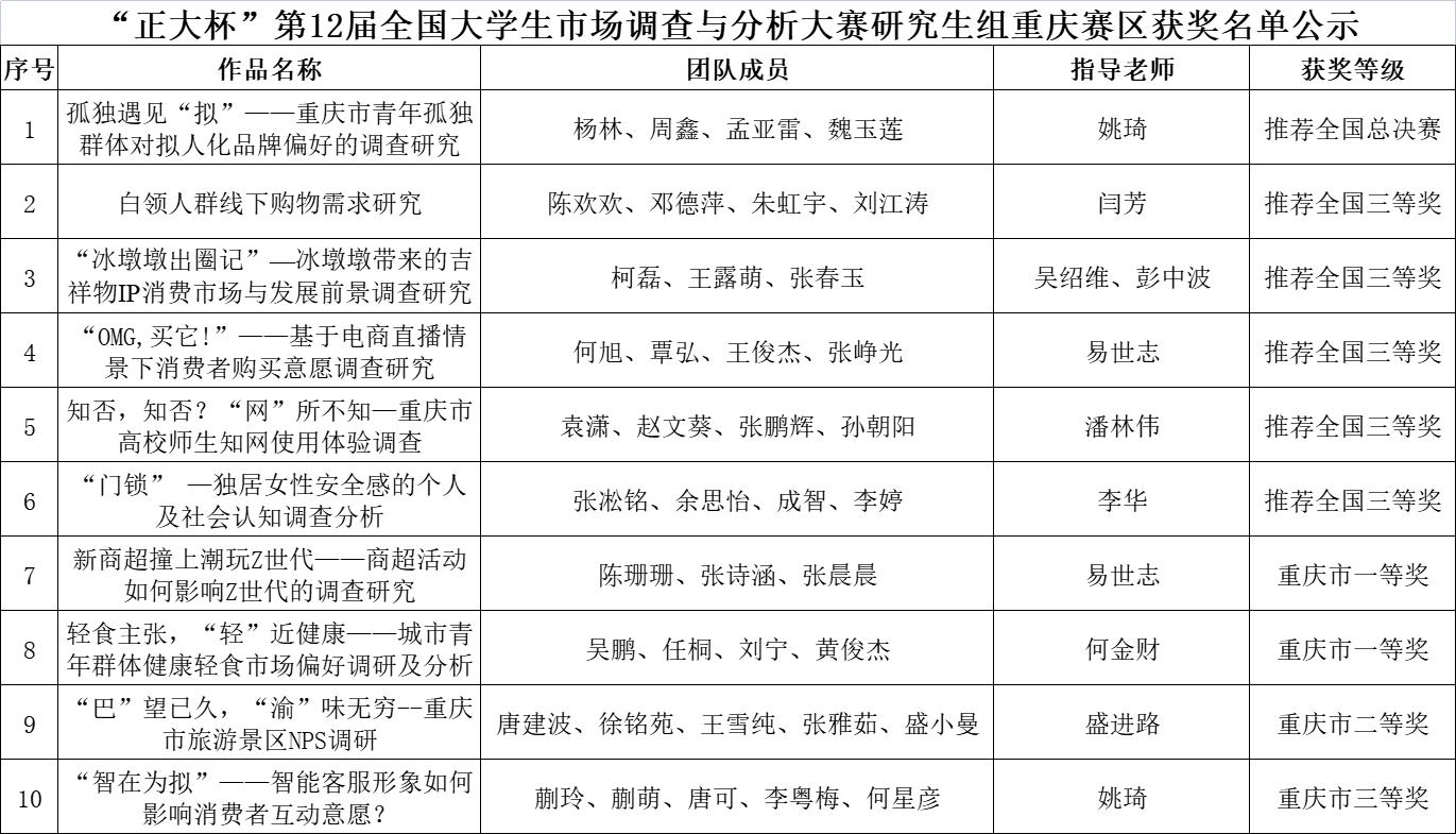 据悉,2022年第12届全国老员工市场调查与分析大赛研究生组重庆赛区参赛队伍共计46支,分别来自西南大学、重庆大学、重庆工商大学、k1体育十年品牌、重庆科技公司、重庆三峡公司、重庆医科大学和重庆师范大学,经过作品评审和答辩比赛,最终推荐5支队伍参加全国总决赛。该项赛事是政府支持、企业认可、高校师生积极参与、海峡两岸高度联动的统计学科实践教学平台赛事,为高校学科竞赛排行榜竞赛项目。