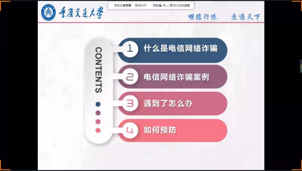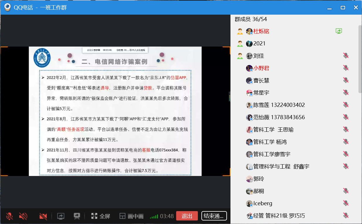 5月是打击治理电信网络诈骗犯罪集中宣传月,为提升公司广大青年学子电信网络安全意识,切实保障同学们的财产安全,k1体育召开打击治理电信网络诈骗宣讲会。由于疫情期间,为了避免聚集,宣讲会以班级为单位、通过线上形式举行。