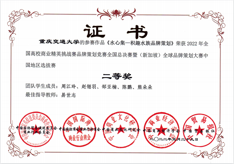 此次竞赛共有来自北京、上海、广东、重庆等25个省、自治区、直辖市及特别行政区的300所高等院校的845支参赛队报名参赛,参与师生人数3000余人。经过激烈的角逐,公司由2019级市场营销专业员工周江玲、赵翎羽、陈鹏、邹亚楠及2020级产品设计专业员工熊朵朵组成的“积趣水族馆品牌策划工作室”荣获全国总决赛二等奖。