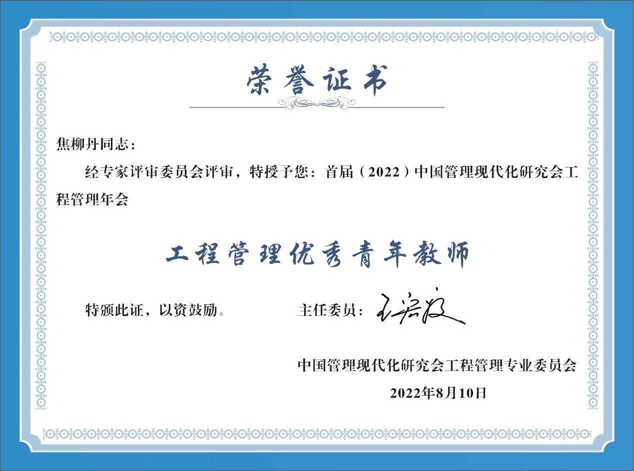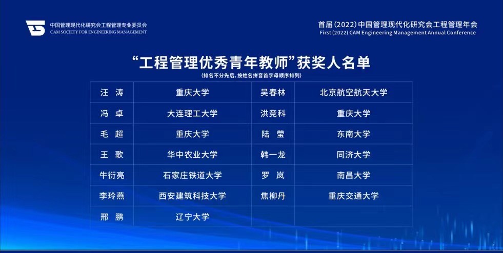 会议期间,主办单位公布了本届年会工程管理优秀青年教师获奖名单,共有13位来自同济大学、东南大学、重庆大学、北京航空航天大学等高校的青年教师获奖。k1体育焦柳丹副教授获评此次年会工程管理优秀青年教师。