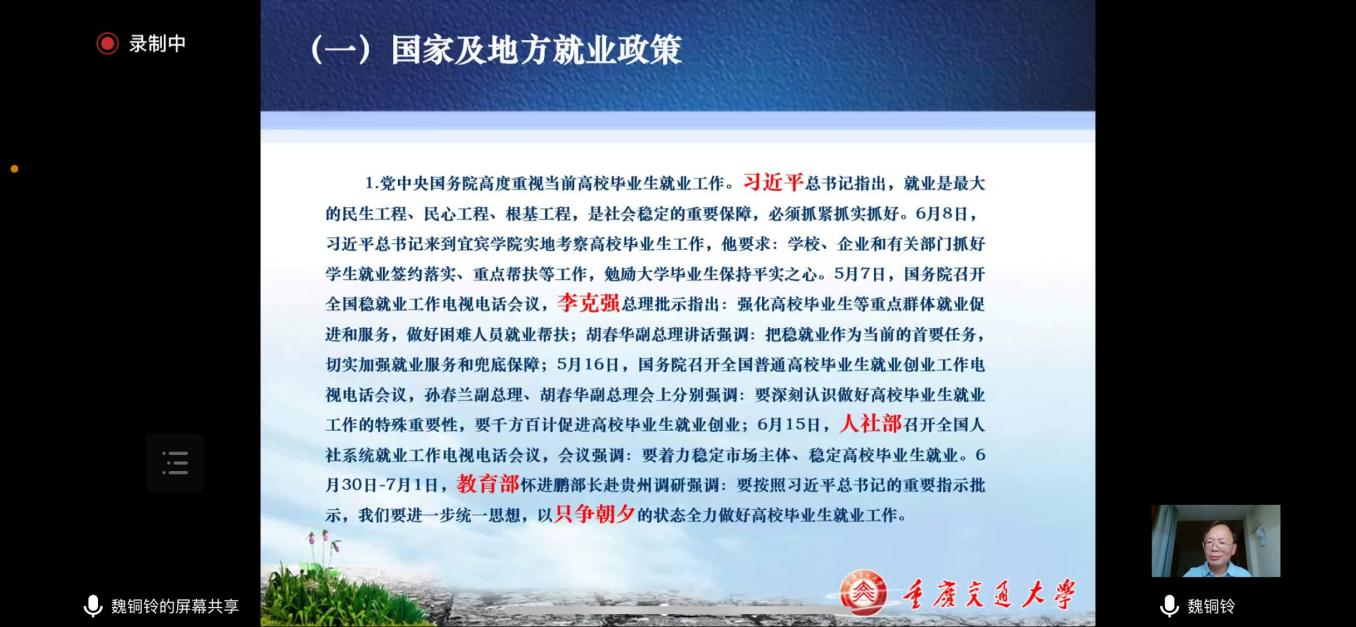 9月8号晚上,k1体育毕业生就业形势与政策专题讲座采取线上形式召开。会议由经济管理公司党委书记魏铜铃主讲,毕业班辅导员和2023届一千余名毕业生参加会议。