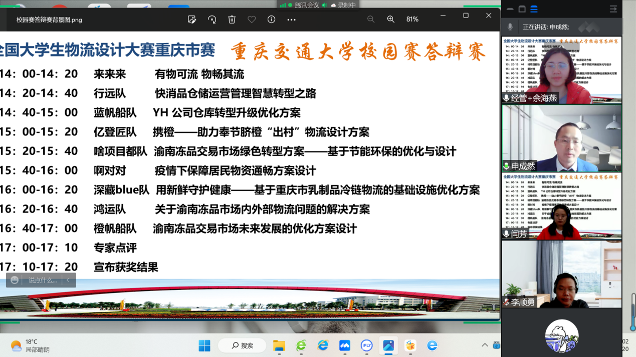 11月20日下午举行线上答辩赛,物流国贸教工党支部的申成然、余海燕、闫芳、李顺勇四位老师和物流管理系谢晓东老师一起担任本次答辩赛评委,答辩赛全程由物流管理系主任申成然副教授主持。