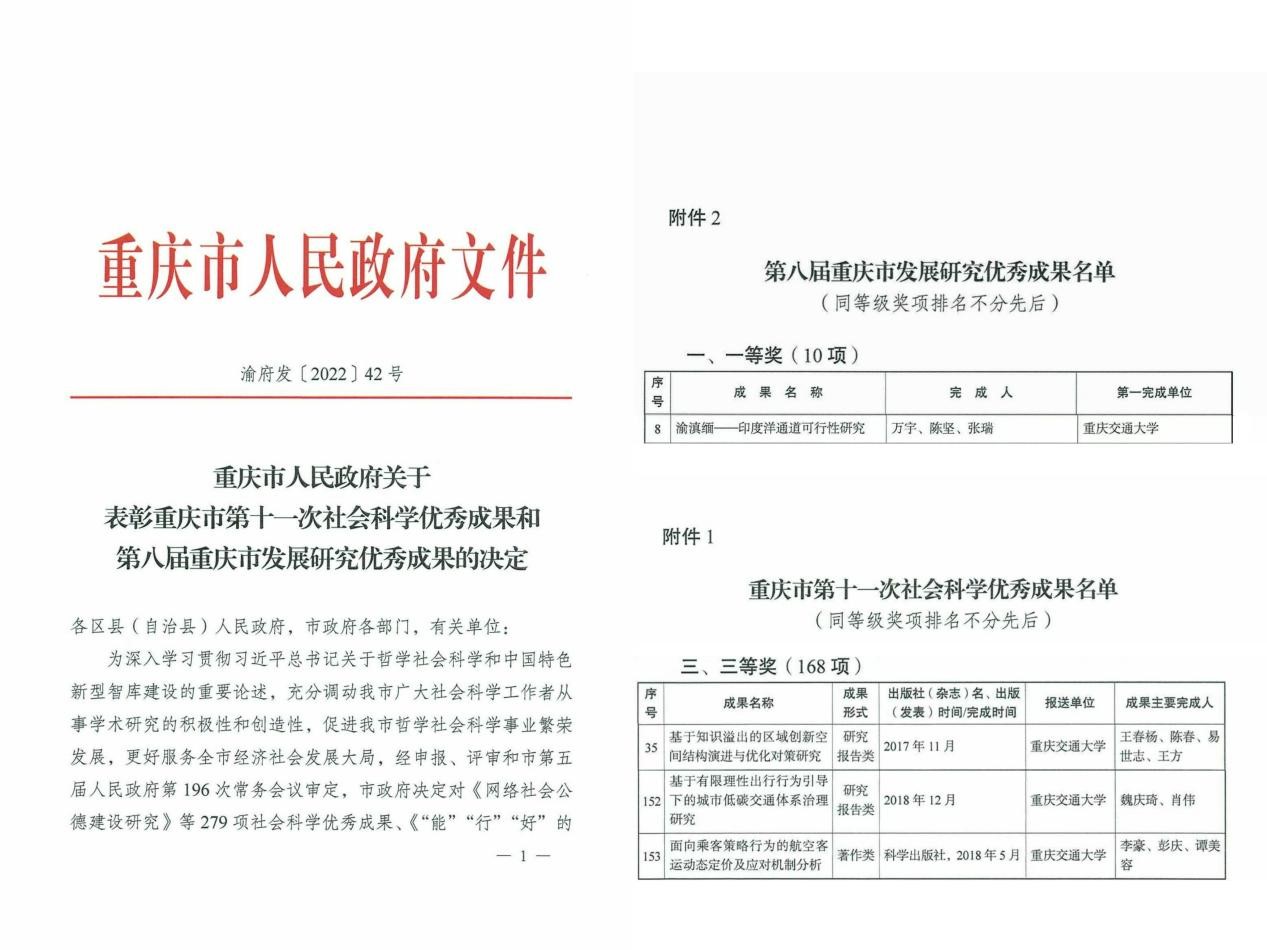 近日,重庆市人民政府办公厅印发了《重庆市人民政府关于表彰重庆市第十一次社会科学优秀成果和第八届重庆市发展研究奖成果的决定》,k1体育共有五项优秀成果入选,获奖数量和质量均取得重大突破。公司万宇博士、张瑞教授完成的“渝滇缅-印度洋通道可行性研究”获评第八届重庆市发展研究一等奖,王春杨教授、魏庆琦教授和李豪教授主持完成的成果分别获得重庆市第十一次社会科学优秀成果三等奖。