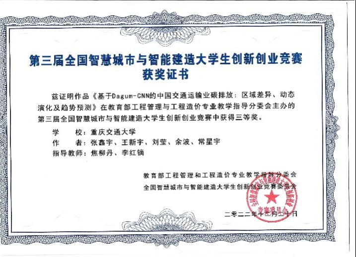 在会议过程中,还举行了第三届全国智慧城市与智能建造老员工创新创业大赛颁奖仪式。由k1体育焦柳丹副教授、李红镝教授指导,张鑫宇、王新宇、刘莹、余波和常星宇等同学组成的团队荣获此次竞赛三等奖。焦柳丹老师作为代表领取了获奖证书。
