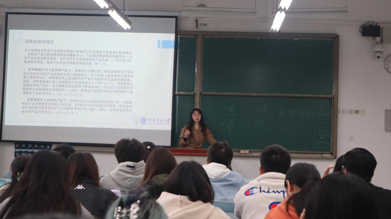 张海月博士首先从个人经历讲起,从本科到博士的攻读生涯、从论文书写到科研选题,不仅是给有志于学术深造的同学擘画蓝图、分享经验,更是激发所有同学的学术热情。接着,张海月博士以“消费者效用”为例,现场带领同学们建立模型,演算分析。最后,张海月博士给同学们留下了三个“展望”方向:直播新业态下供应链的运营优化与协调机制、竞争性直播电商供应链运营优化与协调机制、“直播助农”模式下考虑需求波动的生鲜供应链产能分配与协调策略。希望同学们从中找到感兴趣的方向,激发科研的兴趣。