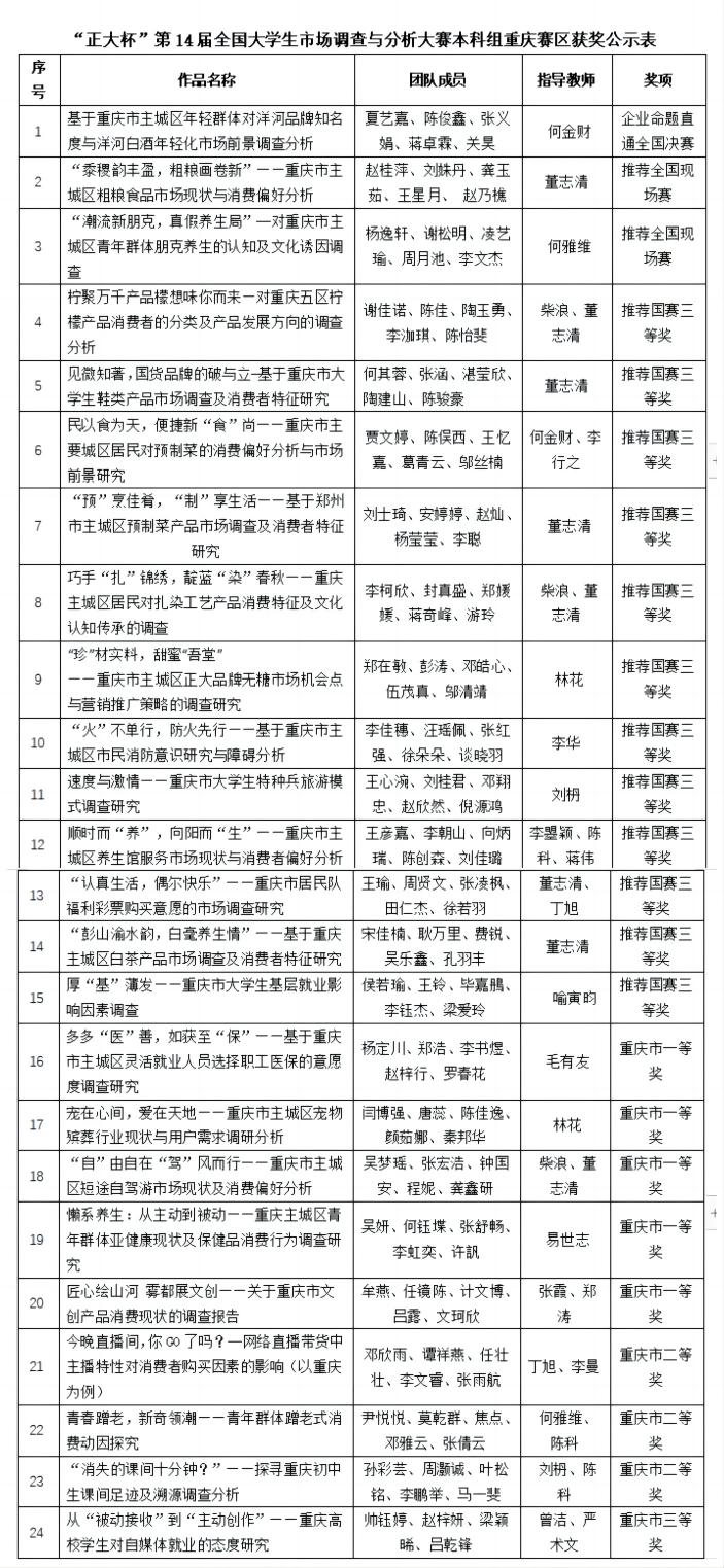 2024年4月27日,“正大杯”第14届全国老员工市场调查与分析大赛本科生组重庆赛区答辩赛顺利结束。由公司k1体育共23支代表队参赛,其中5队入选市答辩赛,有2支队伍被推荐参加全国总决赛,12支推荐国三,5支、3支、1支分获重庆市赛一等奖、二等奖、三等奖。此外,4月18日公布企业命题国赛资格赛入围名单,公司1支代表队成功晋级国赛。