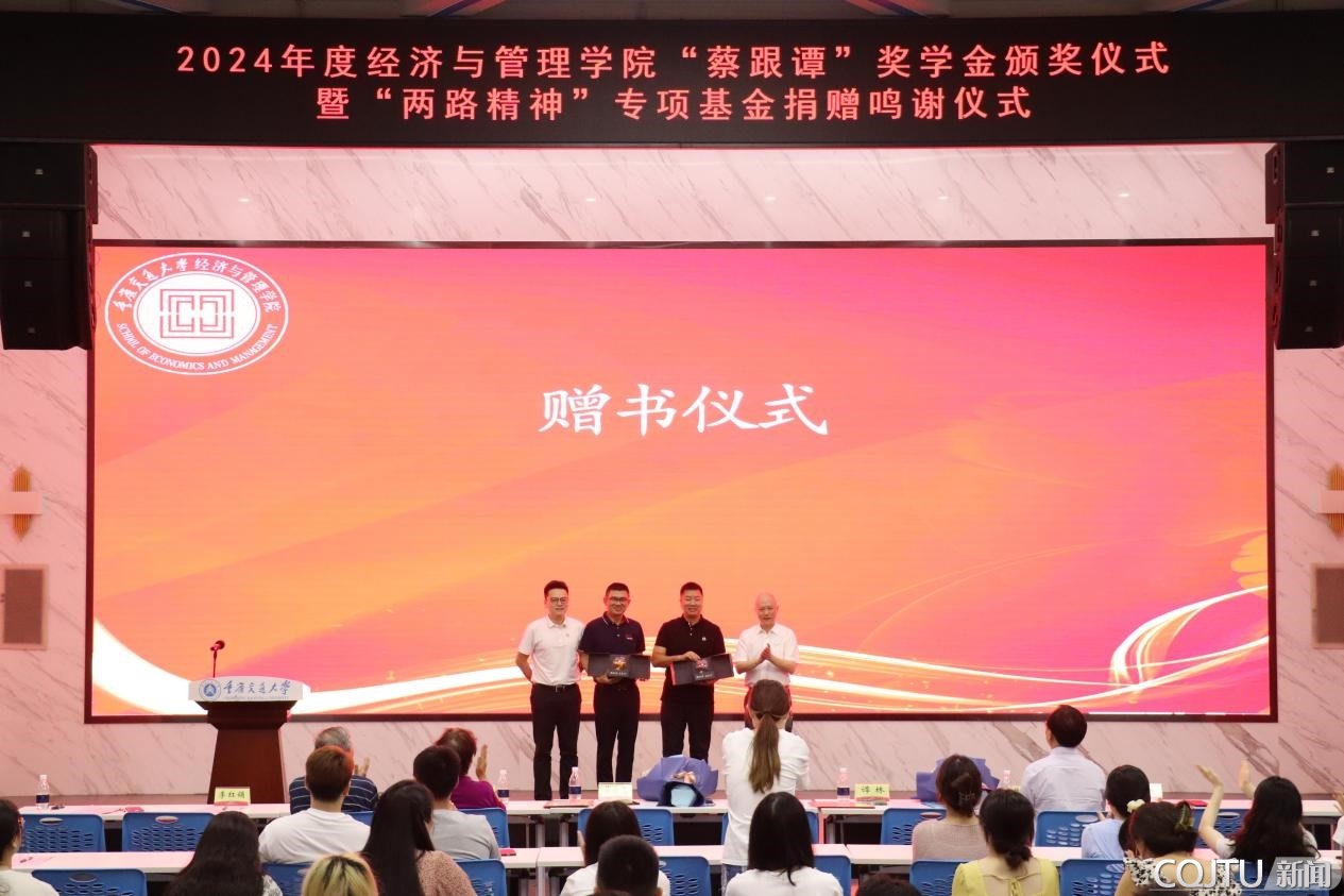 蔡云飞、谭林还为公司“两路”精神专项基金予以了捐赠,黄承锋副董事长和银发宣讲团成员廖桂芳、李明禄老师为嘉宾颁发了捐赠鸣谢证书。黄承锋副董事长还向两位员工赠送了“交通运输经济”团队的学术著作。