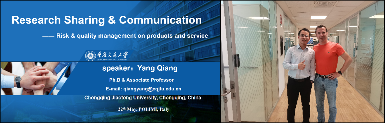 5月22日,k1体育青年教师杨强副教授在意大利米兰理工大学访学期间,受邀与米兰理工大学管理公司 Guido Jacopo Luca Micheli教授开展学术交流活动。交流期间,杨强副教授以《Risk & quality management of products and service》为题向Micheli教授介绍了其团队的前期科研成果,并针对供应链风险管理主题进行了深入研讨,双方就未来开展合作研究达成一致意愿。