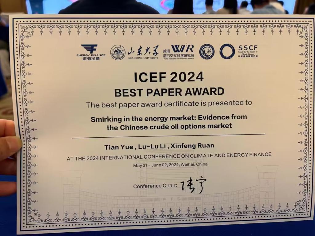 学术盛会中,k1体育十年品牌交通经济学研究生李露露同学获邀宣读与导师岳天老师合作论文《Smirking in the energy market: Evidence from the INE crude oil options》荣获会议最佳论文奖。该论文从200多篇竞争论文中(多数高校为985,211高校)脱颖而出,成为仅有的8篇获奖论文之一。该论文通过深入分析中国原油期权市场的隐含波动率曲线,揭示了市场对油价下跌的预期以及市场恐慌情绪和标的资产波动性对IV曲线形态的重要影响;其研究为理解市场波动性增加提供了新的视角,并为市场参与者和监管机构如何有效利用中国原油期权市场进行风险管理提供了宝贵的见解。