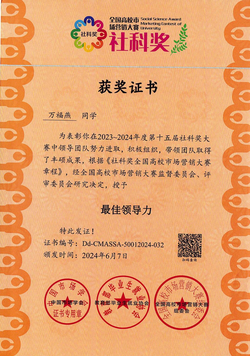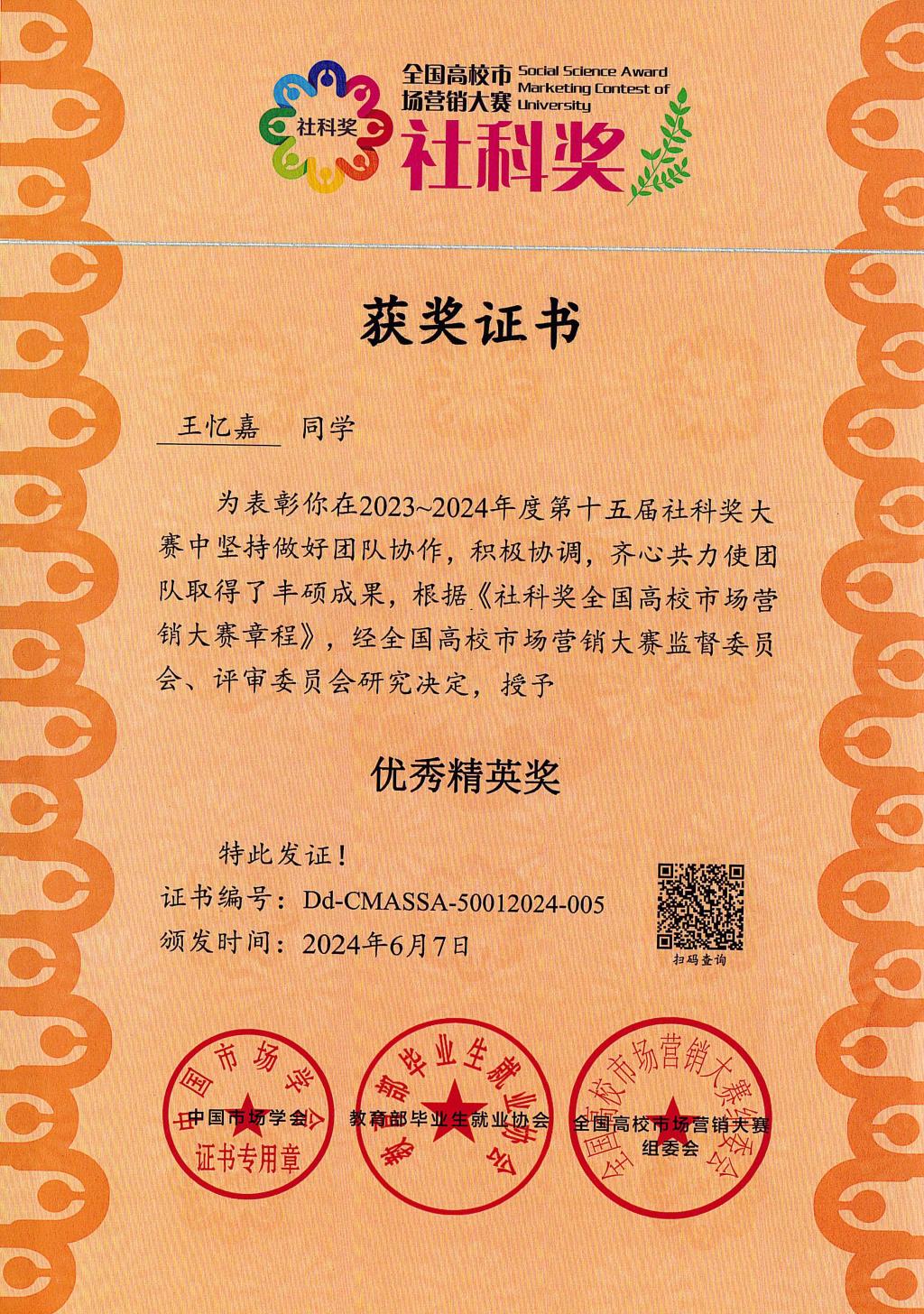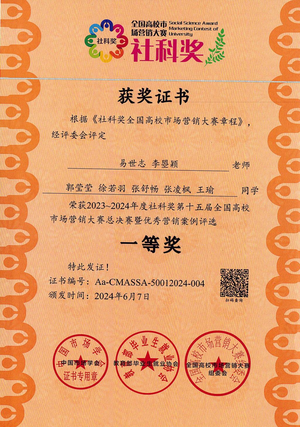 2024年6月1-2日,由中国市场学会、教育部毕业生就业协会主办的社科奖第十五届全国高校市场营销大赛全国总决赛圆满落幕。以公司市场营销2021级员工为主的团队喜获佳绩,获全国总决赛一等奖1项(全国第二名)、二等奖2项、三等奖3项;王忆嘉获优秀精英奖、万福燕获最佳领导力奖;同时,公司获“营销实践教学示范奖”。这是公司参加此项大赛以来取得的最好成绩。