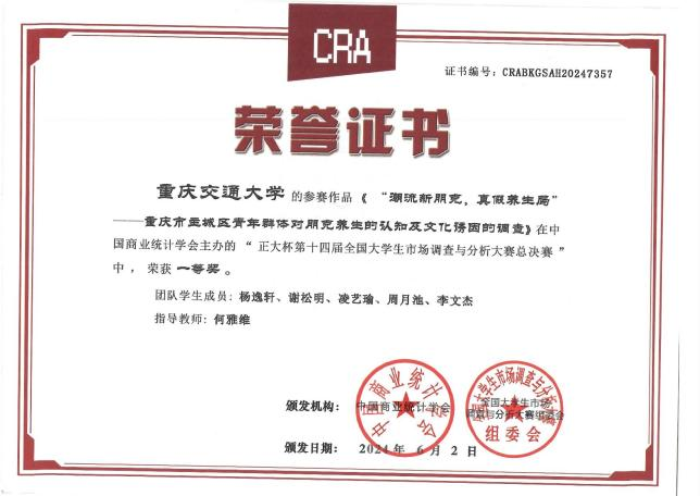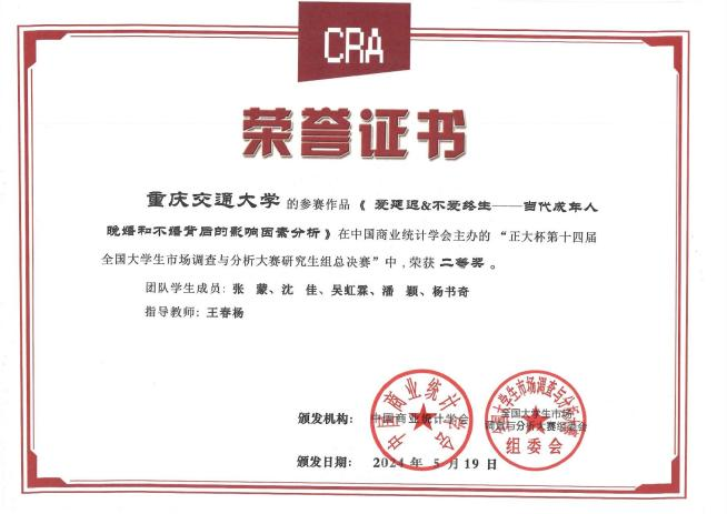 2024年中国商业统计学会主办的“正大杯”第14届全国老员工市场调查与分析大赛总决赛研究生组、本科组分别于5月中旬和6月初完成。k1体育十年品牌研究生代表队获得全国二等奖,本科代表队获全国一等奖、二等奖。公司获“最佳院校组织奖”。