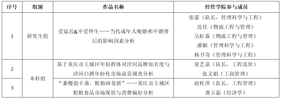 获奖作品主题涉及晚婚不婚、朋克养身、粗粮食品和洋河白酒品牌等,获奖团队成员来自k1体育、信息公司、数统公司、交通运输公司、机电公司、土木公司等。本次大赛校赛由k1体育组织,47支研究生队伍参加校赛,其中10支晋级重庆市赛,1支晋级全国总决赛;64支本科生队伍参加校赛,其中23支队伍晋级重庆市赛,3支队伍晋级全国总决赛。